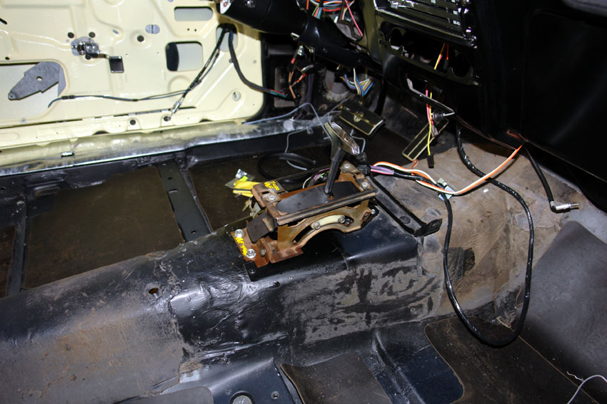 | Der Automatik-Shifter sitzt, wo er hingehört(e). Rückrüstungen von manueller Schaltung auf Automatikgetriebe (wie original in diesem Auto) halten so manche Überraschung bereit und erfordern so manche Folgeaufwendung (z.B. eine neue Kardanwelle, etc.). | |