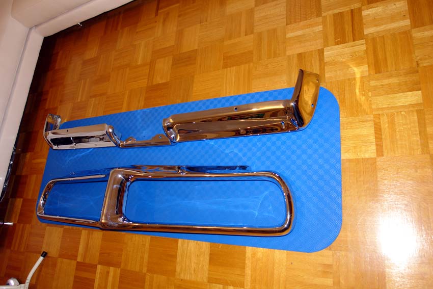 So sieht übrigens unpolierter Chrom aus: schwarz! Wusste ich vorher auch nicht. Außerdem traute ich der ganzen Sache nicht, war mir zu rau und hinsichtlich eines künftigen Rostbefalls zu unsicher. Habe die Rückseite also entfettet und zunächst mit POR 15, dann mit POR Stirling Silver gestrichen - beides Rostverhütungslacke, die unter Feuchtigkeitseinfluss aushärten und sehr steinschlagresistent sein sollen. POR 15 alleine ist aber nicht UV-resistent und das Stirling Silver habe ich auch aus dem Grund verwendet, da ich mir nicht sicher war, inwieweit sich die Rückseite der Stoßstangen aus bestimmten Winkeln einsehen lassen würde. |