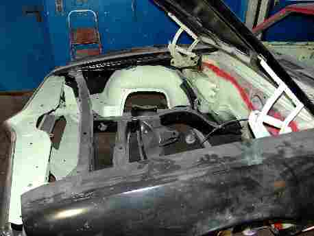 Zurück zum Auto: inzwischen vom hinteren in den vorderen Teil der Werkstatt umgezogen (auf einem extra geschweißten 4-Kant-Rahmengestell) werden Kotflügel, Front mit Stoßstange und Motorhaube aufeinander abgestimmt. |