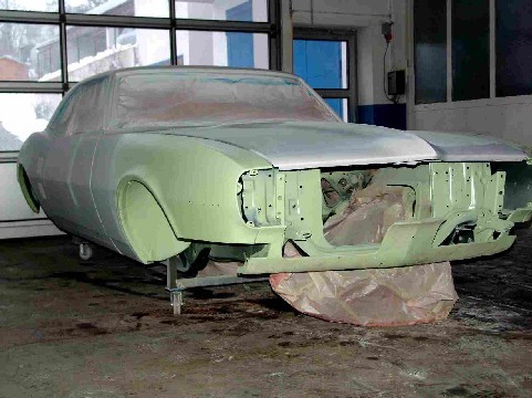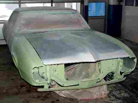 Und jetzt geht der Spaß richtig los! Alle Bleche richtig eingepasst, Auto komplett angeschliffen (inkl. nicht gestrahlter Motorhaube und Dach – war uns zu gefährlich wegen mögl. Verwerfungen), mit Epoxy geprimert und jetzt das erste Mal gefillert. Gut zu sehen: die Motorhaube ohne Hood-Scoops, eigentlich einer 350er Motorhaube. Aber perfekt in Schuss ohne jeglichen Rost. Da beim „normalen“ 400er die Scoops (= 2 kleine Hutzen auf der Motorhaube) ohnehin keine Funktion hatten (anders beim RamAir, dienten dort zur Luftzufuhr) werde ich sie beibehalten. Neue oder gut erhaltene 400er Motorhauben sind kaum zu bekommen, die Repros haben – trotz exorbitanter Preise - einen mehr als zweifelhaften Ruf. |